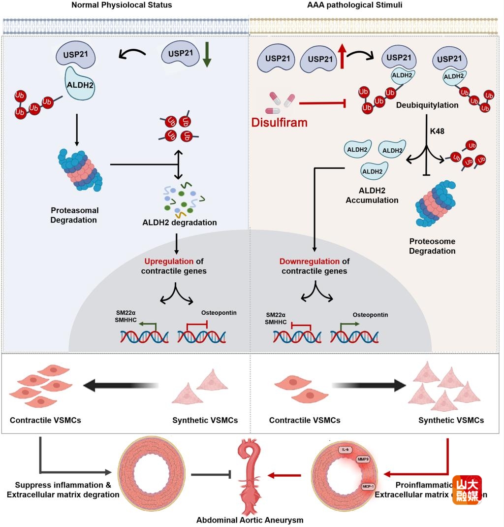 研究团队通过蛋白质组学分析发现USP21在AAA患者临床病理组织以及小鼠AAA疾病模型中显著高表达。在功能方面,通过构建USP21基因敲除小鼠,建立经典的血管紧张素II(Ang II)诱导的AAA模型和猪胰弹性蛋白酶(PPE)诱导的AAA模型,证实了USP21对AAA发生发展具有显著促进作用。接下来,团队揭示了USP21通过调控血管平滑肌细胞(VSMCs)表型转换,进而加剧AAA形成及弹性纤维断裂等病理变化的机制。此外,团队进一步鉴定出乙醛脱氢酶2(ALDH2)是USP21发挥重要功能的关键下游靶蛋白,并深入解析了USP21与ALDH2的分子互作和调控机理。研究发现,USP21通过其泛素特异性蛋白酶结构域与ALDH2蛋白结合,依赖其蛋白酶活性中心,尤其第221位半胱氨酸发挥作用,去除ALDH2的K48泛素链修饰,进而增强ALDH2蛋白质稳定性。通过构建ALDH2基因敲除小鼠以及ALDH2 E506K点突变小鼠(模拟人类rs671变异的ALDH2基因敲入模型),团队证实USP21对AAA的促进作用在ALDH2功能缺失或突变小鼠中显著降低。