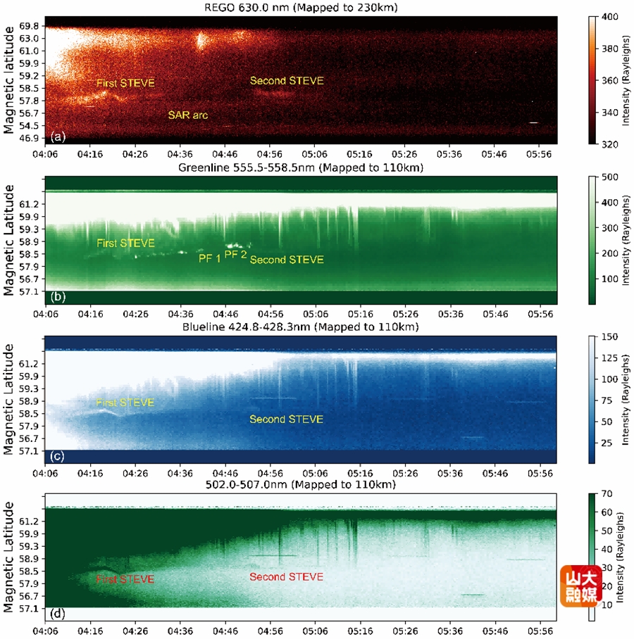 图2. 过渡区探测器光谱仪(Transition Region Explorer (TREx) spectrograph)在Lucky Lake台站观测到的不同辐射波段数据。(a)红光630.0 nm、(b)绿光 557.7 nm、(c)蓝光486.1 nm以及(d)无特定大气发光的502.0-507.0 nm波段。由(a)(c)(d)可明显定位出两段STEVE,(b)中是仅出现Picket Fence阶段。