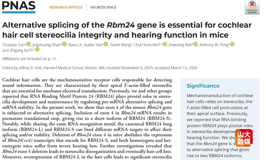 [本站讯]4月13日,生命科学学院徐志刚教授团队在《美国科学院院刊》(PNAS)在线发表题为“Alternative splicing of theRbm24gene is essential for cochlear hair cell stereocilia integrity and hearing function in mice”的研究论文,报道了Rbm24基因可变剪接调控静纤毛发育及听觉转导的分子机制。