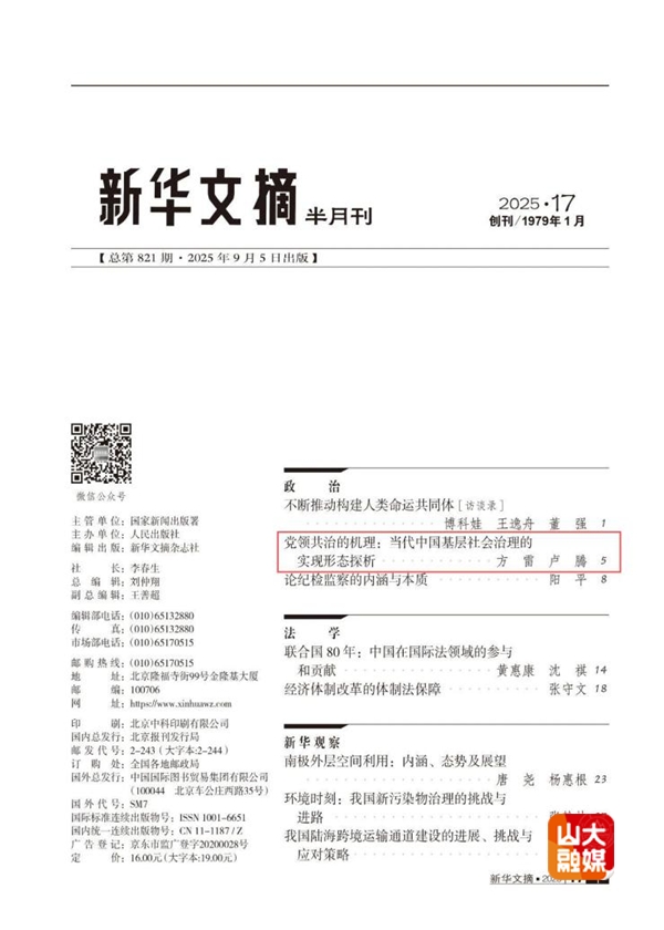 [本站讯]近日,政治学与公共管理学院、当代社会主义研究所方雷教授团队发表于《治理研究》2025年第2期的《党领共治的机理:当代中国基层社会治理的实现形态探析》一文被《新华文摘》2025年第17期全文转载。