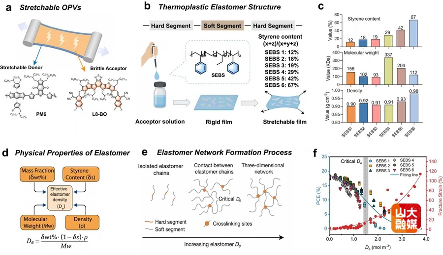 进展一:可拉伸有机光伏在柔性可穿戴电子设备方面展现出巨大应用潜力,添加低成本的热塑性弹性体被广泛用于改善有机太阳能电池的机械稳定性。热塑性弹性体具有结构多样性,其对活性层形貌、光电及力学性能的影响尚不清晰,制约可拉伸有机光伏的性能。研究团队系统研究了热塑性弹性体结构多样性对器件性能的影响,提出了“有效弹性体密度”概念,揭示了弹性体结构多样性与有机光伏激子及载流子动力学、形貌、光电和力学性能的关联机制,实现弹性体增韧器件中效率和机械性能的协同优化。相关研究成果以“Control of Effective Elastomer Density Enables Mechanically Robust and High‐Efficiency Intrinsically Stretchable Organic Solar Cells”为题发表于Advanced Materials,山东大学博士研究生孙铭为论文第一作者。通讯作者为山东大学教授郝晓涛、杜晓艳,天津大学教授叶龙。山东大学为第一作者单位和通讯作者单位。