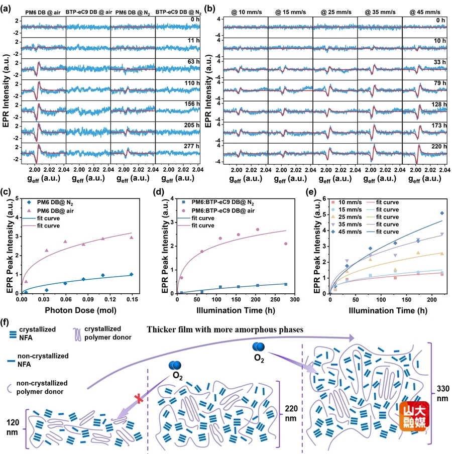 进展二:随着有机光伏能量转换效率的提高,增强与大规模生产工艺兼容的器件的稳定性至关重要。研究团队对空气中制备的有机太阳能电池的稳定性进行了深入研究。在光照下,厚活性层器件比薄活性层器件显示出更快的陷阱态产生、电荷收集效率降低以及短路电流密度衰减。在排除活性层材料降解及形貌的变化之后,研究阐明其衰减主要来自于聚合物给体在光照下产生的自由基。厚活性层在单位厚度中具有更多非晶相,空气中的氧分子更易扩散,光照下产生更多自由基,从而引起器件性能的快速衰减。该工作为设计高效、稳定、可规模化制备的有机太阳能电池提供了重要参考。相关工作以“Enhance Photo-Stability of Up-Scalable Organic Solar Cells: Suppressing Radical Generation in Polymer Donors”为题发表于Advanced Materials,山东大学硕士研究生肖梦飞为论文第一作者,通讯作者为杜晓艳教授,山东大学为论文第一作者单位和唯一通讯作者单位。