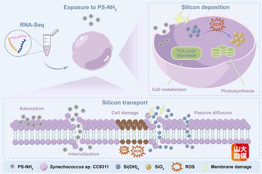 海洋硅循环是全球生物地球化学循环的关键环节,聚球藻作为贡献约16.7%海洋净初级生产力的重要生物,其硅积累能力对于稳定海洋硅循环平衡具有关键作用。本研究首次阐明胺修饰聚苯乙烯纳米塑料(PS-NH2)调控海洋聚球藻(Synechococcussp. CC9311)的硅代谢过程、干扰海洋硅循环的核心机制。研究发现,PS-NH2对聚球藻硅代谢的调控呈浓度依赖性:环境相关浓度(0.1 μg/mL)PS-NH2通过改变细胞表面微环境促进胞外生物硅沉积;而较高浓度(0.5-2.0 μg/mL)PS-NH2使胞内硅积累量显著增加,且这一硅代谢过程的适应性转变,是细胞抵御纳米塑料胁迫的重要保护机制。本研究为评估纳米塑料对海洋生态系统元素循环的潜在影响提供了关键科学依据。
