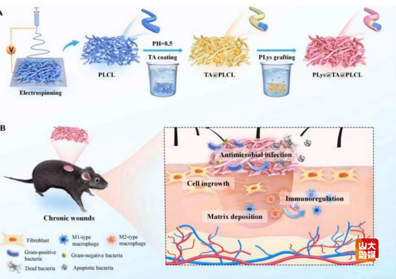 [本站讯]近日,山东大学齐鲁医院(青岛)整形美容科主任赵海光教授团队在Materials Today Bio(中科院1区Top期刊,IF:10.2)上发表题为“Nanofibrous dressings incorporating a synergistic antibacterial-anti-inflammatory effect for infected wound healing”的研究成果。该研究报道了一种新型纳米纤维敷料(PLys@TA@PLCL)通过整合电纺纳米纤维的物理屏障特性、生物大分子聚赖氨酸(PLys)的抗菌活性以及天然大分子单宁酸(TA)的抗炎抗氧化作用实现抗菌-抗炎的协同效应。