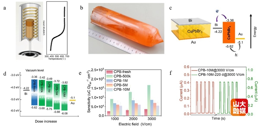 a)炉体与温场;b)直径51 mm、长度170 mm的CsPbBr3单晶;c)非对称电极结构及其对应的能级图;d)器件能级随辐照剂量变化的示意图; e)不同剂量辐照后器件的平均X射线灵敏度; f) CPB-10M器件的220天后X射线响应