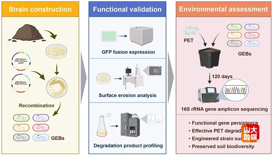 [本站讯]近日,微生物改造技术全国重点实验室李越中教授团队在Journal of Hazardous Materials期刊上发表题为“A strategy forin situsustainable PET degradation in soil by genetically engineered bacteria constructed from indigenous strains”的研究论文。该研究提出了一种“就地取材”的新策略:通过对土壤土著菌株进行基因工程改造,实现了聚对苯二甲酸乙二醇酯(PET)的原位、可持续降解。实验室硕士研究生来雅珺、博士后万田雨为该论文的共同第一作者,实验室副研究员卓丽、李越中教授为共同通讯作者,山东大学微生物改造技术全国重点实验室为唯一作者单位。